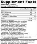 Mushroom extract (Maitake Fruiting Body 10:1 Extract, Shiitake Fruiting Body 10:1 Extract, Lion’s Mane Fruiting Body 10:1 Extract, Reishi Fruiting Body 10:1 Extract, Cordyceps Fruiting Body 10:1 Extract, Chaga Fruiting Body 10:1 Extract, Turkey Tails Fruiting Body 10:1 Extract, White Button Mushroom Fruiting Body 10:1 Extract, Black Fungus Fruiting Body 10:1 Extract, Royal Sun Mushroom Fruiting Body 10:1 Extract), glucose syrup, sugar, dextrose, pectin, citric acid, natural raspberry flavor, sodium citrate, purple carrot juice concentrate, palm oil (contains carnauba wax).